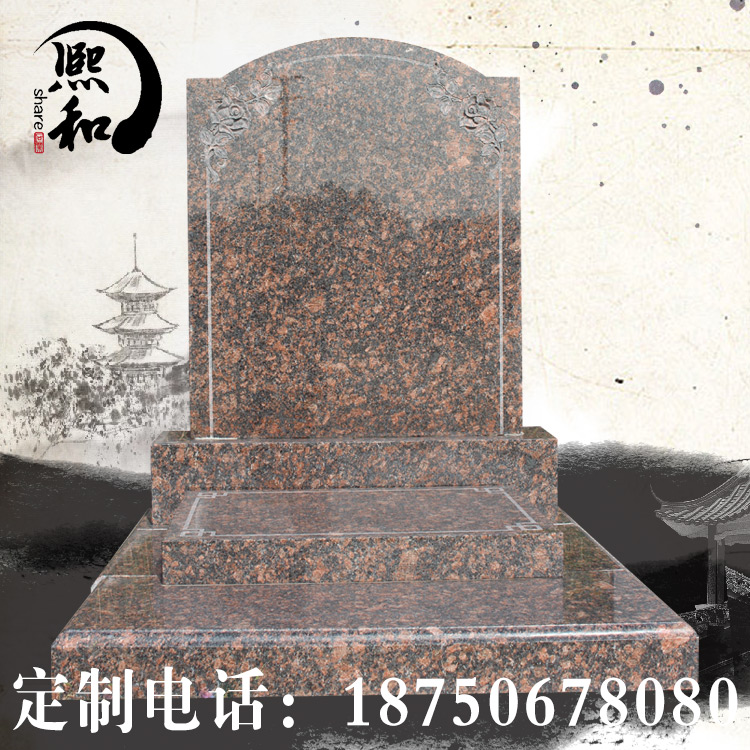 墓碑所使用的材料是最常用的石材英国棕石材雕刻而成。盖板造型独特,雕刻花纹图案。碑板为宽0.6米高0.9米组成,主要用来雕刻碑文。款式 简单素雅,庄重大方。底座也是有英国棕石材雕刻而成。该款