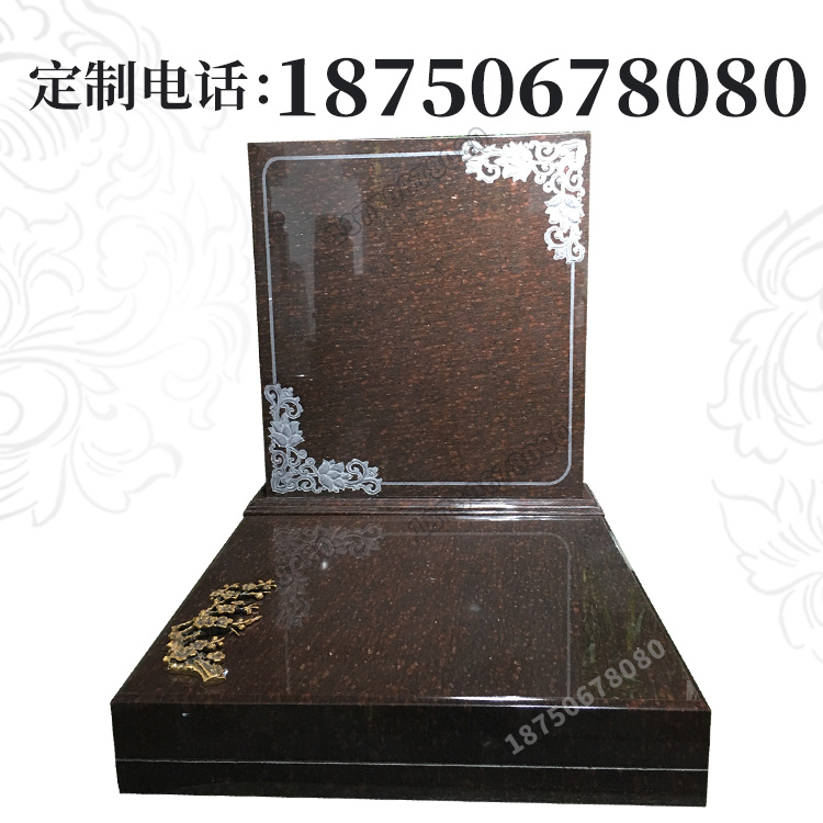 此款石雕墓碑由印度红碑板搭配山西黑石材加工而成,碑板上左...