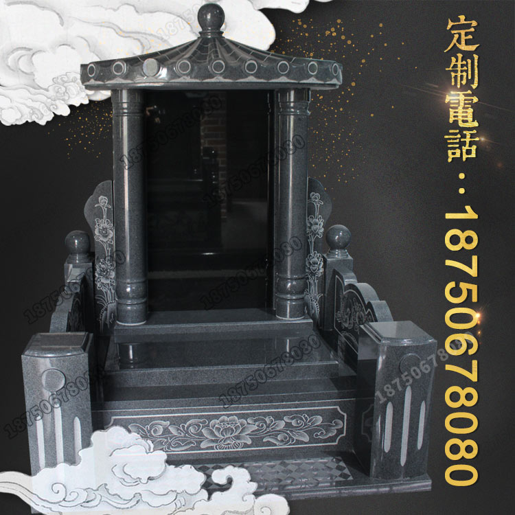 要求的庄重肃穆相契合。瓦盖盖采用中式屋檐款式细致流畅,碑耳碑柱为线雕花草,盖板雕刻印花,当然这些图案和内容可根据客户当地风俗及要求进行优化。