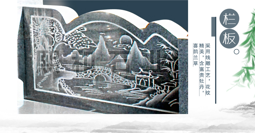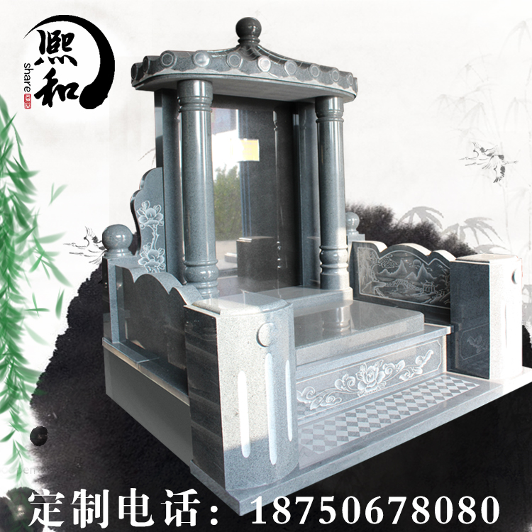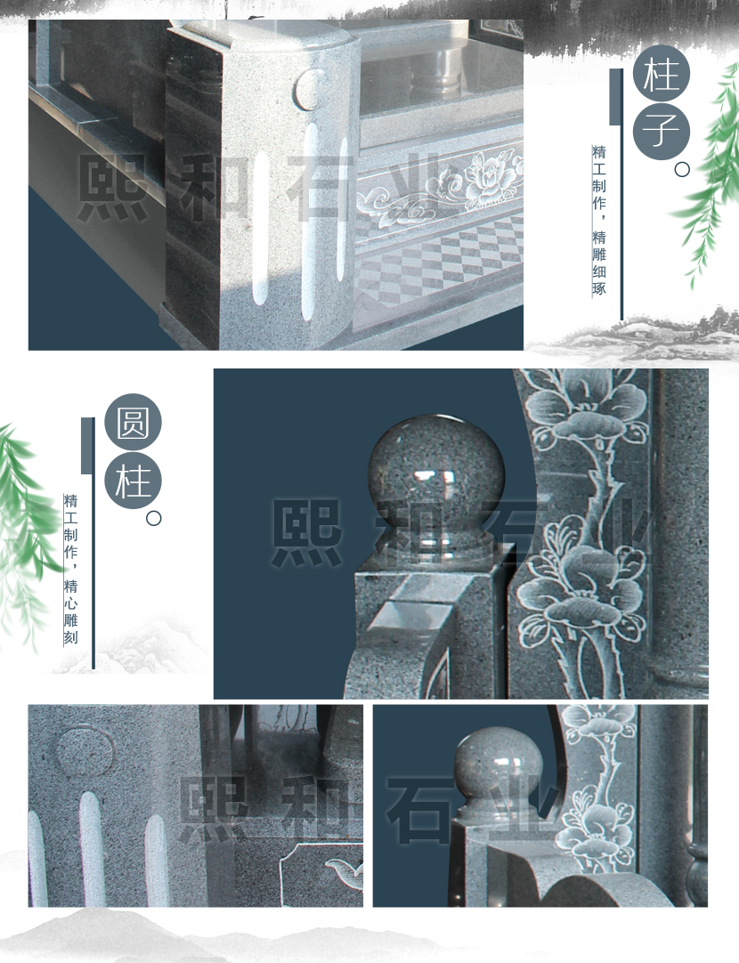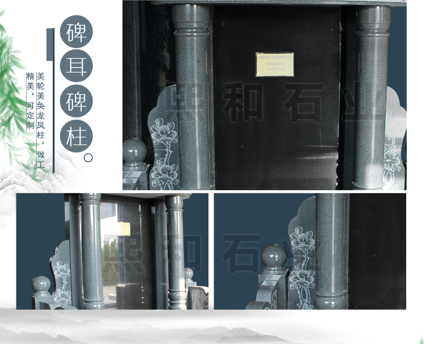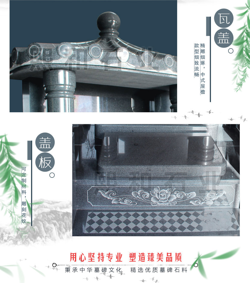 其中,主碑板、盖板使用深色系花岗岩,和中国传统墓碑要求的庄重肃穆相契合。瓦盖盖采用中式屋檐款式细致流畅,碑耳碑柱为线雕花草,盖板雕刻印花,当然这些图案和内容可根据客户当地风俗及要求进行优化。