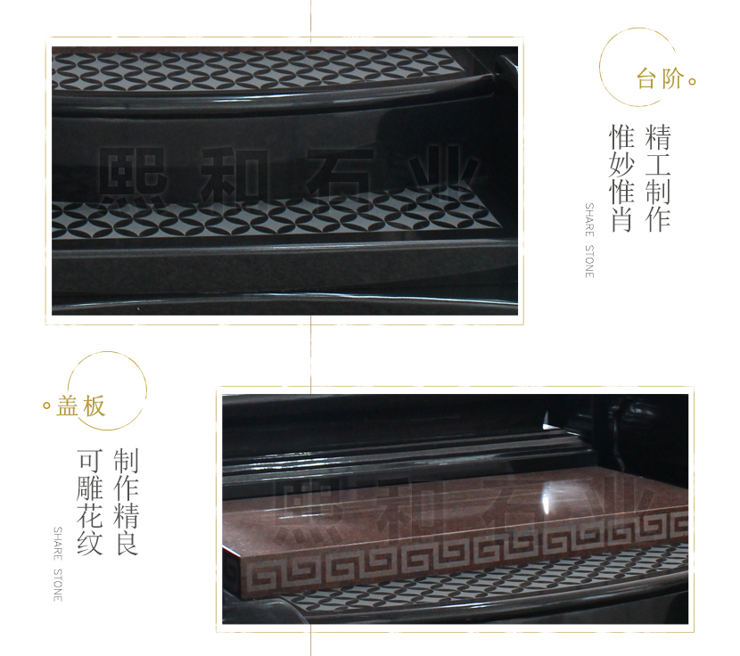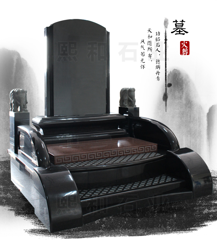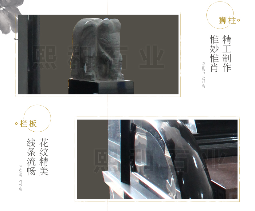 墓碑所使用的材料是最常用的主碑板山西黑,盖板印度红相结合。碑板为山西黑宽0.8米高1米组成,主要用来雕刻碑文。款式 简单素雅,庄重大方,栏板上雕刻精美图案,加上碑柱两侧的碑耳和下沉的台阶。栏板之间由芝麻黑石雕小圆柱雕刻而成。该款