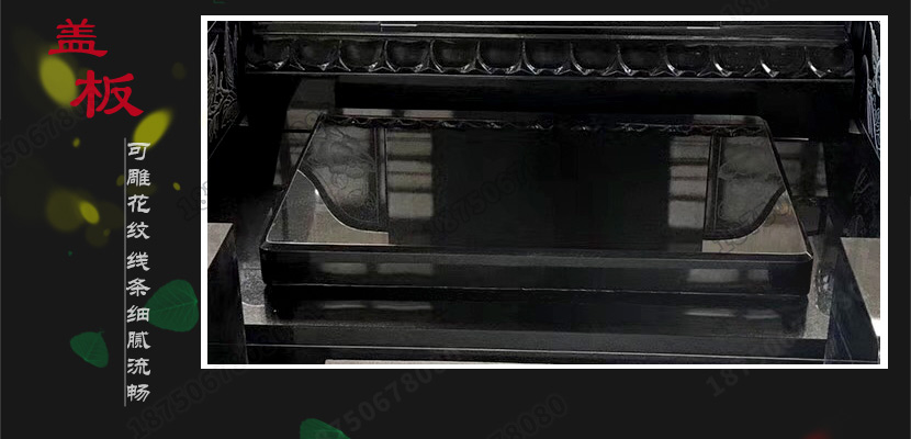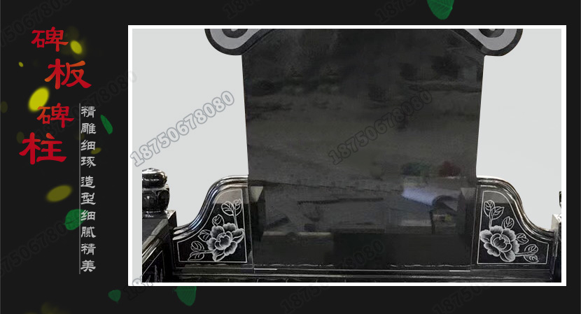 这款墓碑采用全山西黑石材雕刻而成,系我国墓碑市场上的中高档墓碑。碑耳和栏杆均采用线雕技艺雕刻,碑柱和踏板壁采用浮雕技艺雕刻,使得整套墓碑给人以生机盎然之感。这款墓碑造型新颖大气,彰显端庄大气之感,深受各地陵园公墓热订。