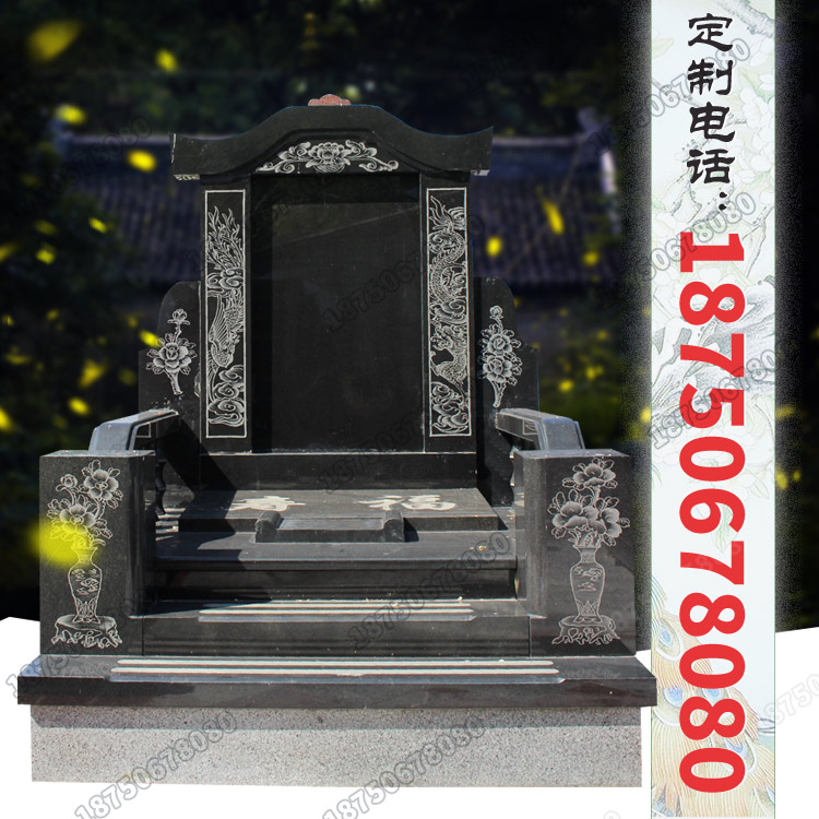 该款墓碑为典型的国内中式豪华墓碑,雕艺精湛,工艺考究。造型奇特的碑顶中央雕刻着花草纹饰,碑柱为线雕龙凤搭配同样采用线  雕技艺的碑耳,使得整座墓碑更具有生机。镂空的栏板以及雕刻着“福寿”二字的盖板,寄予了生者对逝者的美好愿望。整座墓碑采用全山西黑花岗岩石材,沉稳大气端庄,深受各地的人们喜爱。