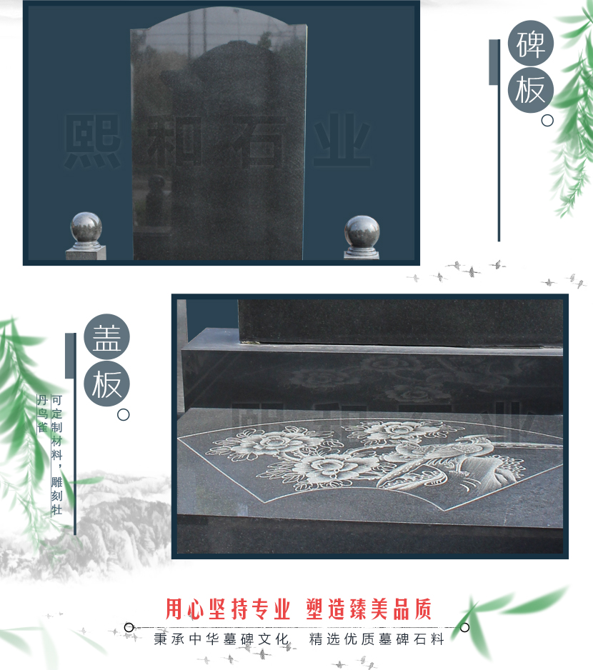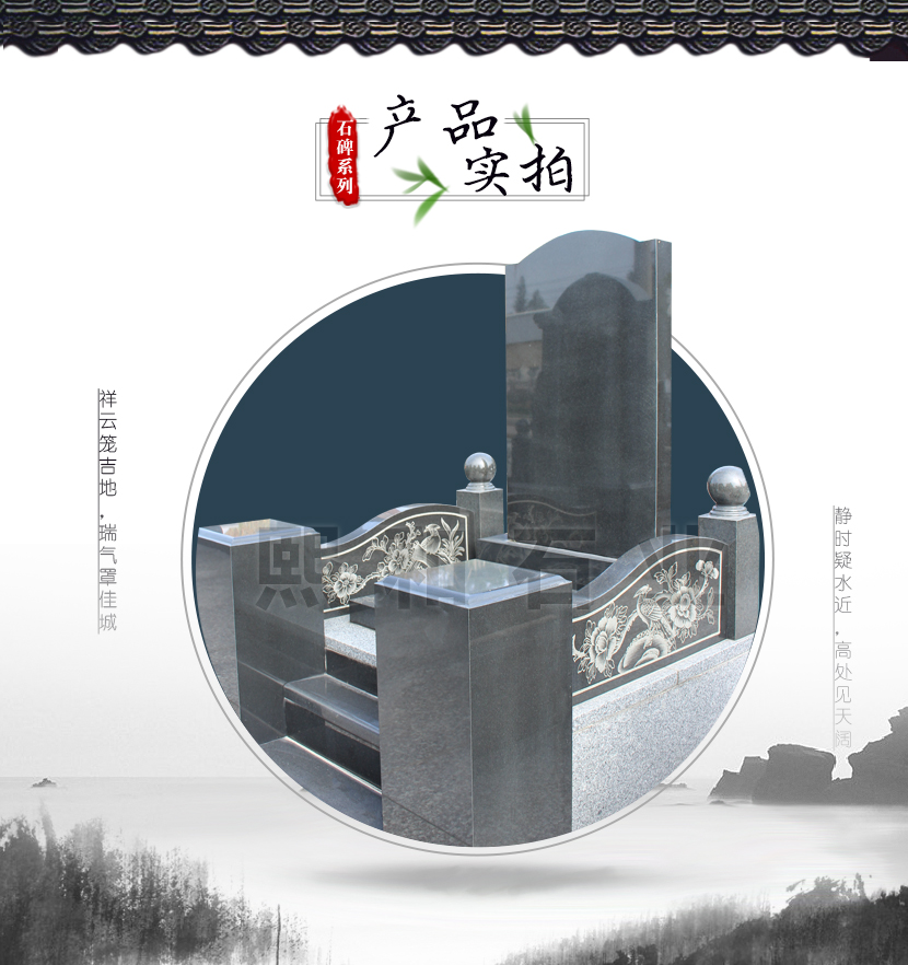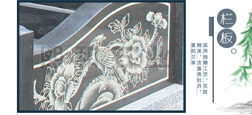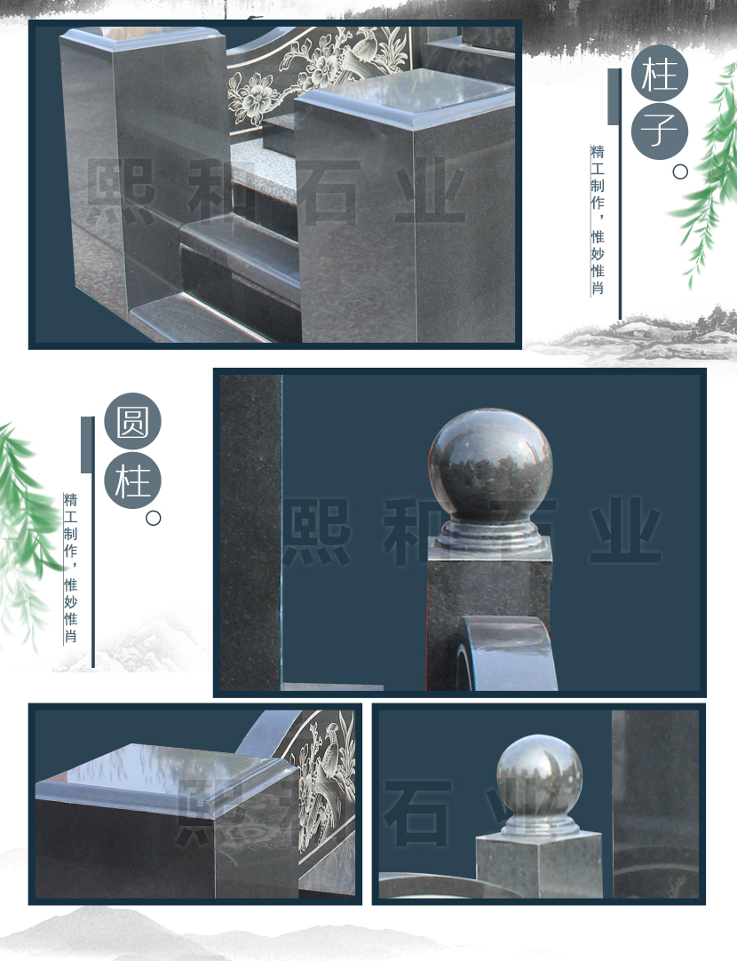 相结合,方形碑柱与圆柱想结合,栏板上雕花图案,当然这些图案和内容可根据客户当地风俗及要求进行优化。