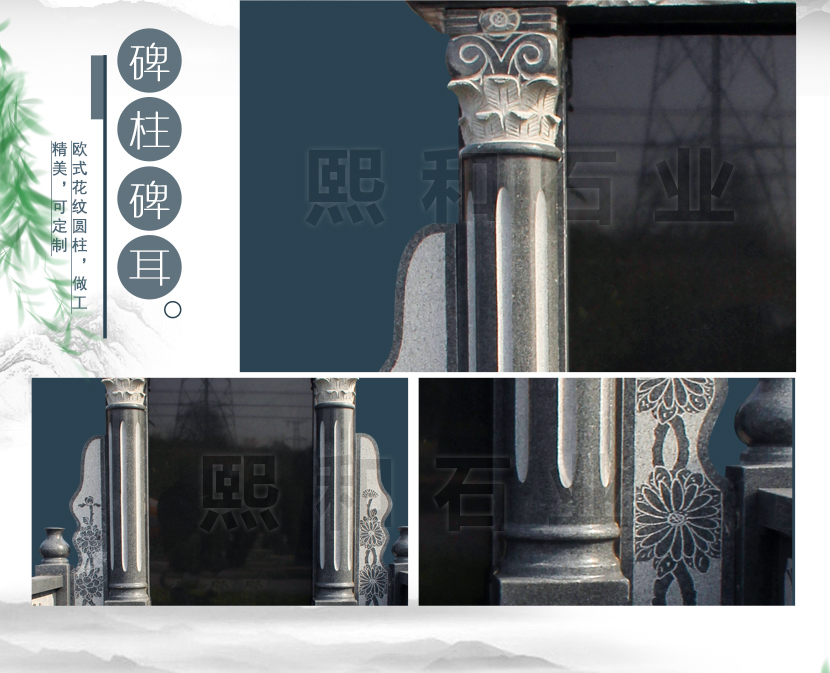 ,采取的是艺术墓碑与传统墓碑相结合,欧式风格墓碑,欧式花纹圆柱,瓦盖欧式雕花,当然这些图案和内容可根据客户当地风俗及要求进行优化。前柱使用石雕狮子,寓意生生不息、家族繁衍、社会繁荣。