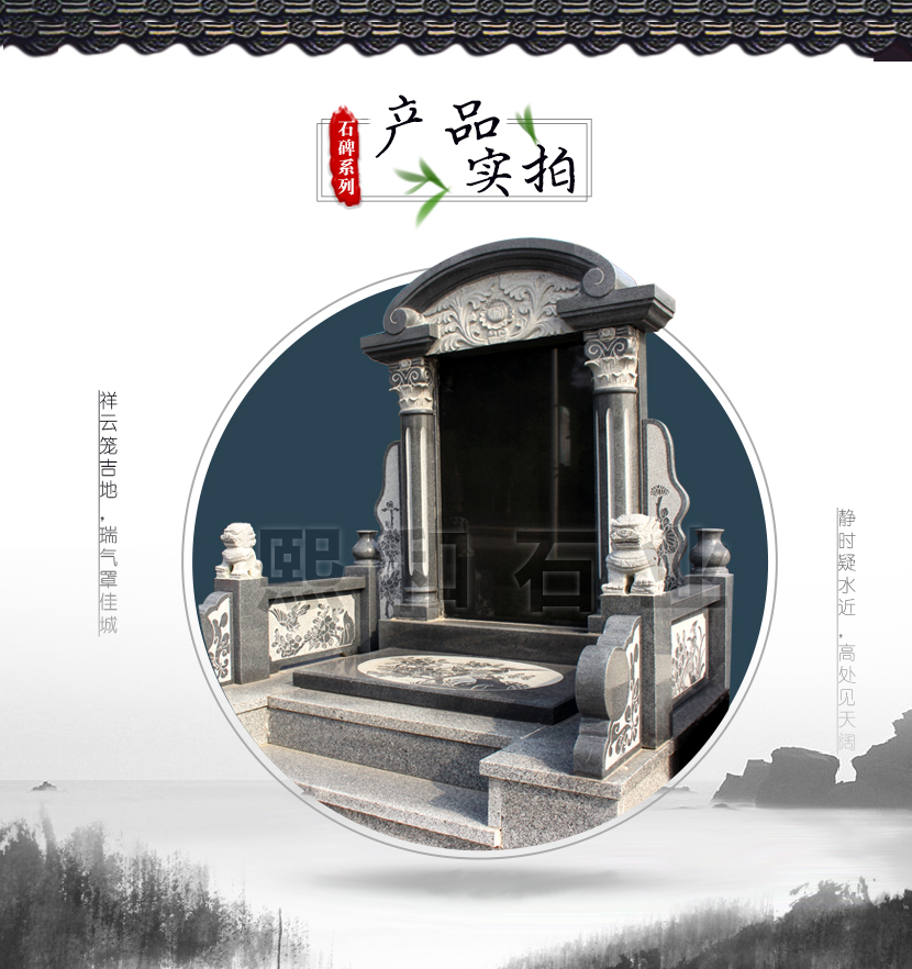 此款碑型清新典雅,整体造型简洁大方。材质使用的是经典的山西黑加芝麻白的搭配。