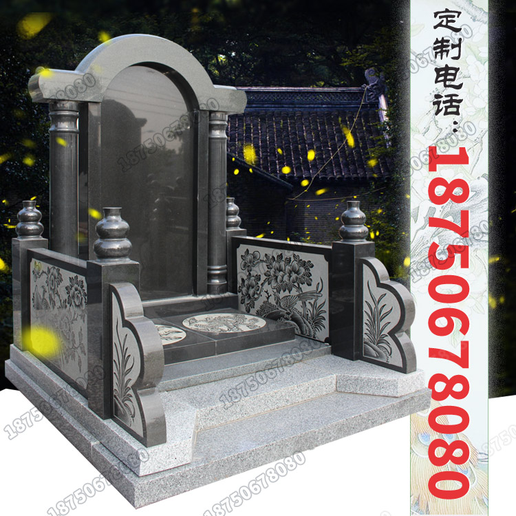 属于高档豪华双人石雕墓碑,整体均采用全山西黑花岗岩石材,款式简单又不失大气,经典罗马柱,线条栏板、盖板、抱鼓,无不彰显精湛的雕刻技艺。石材表面光泽度高,采用线雕和圆雕工艺,成熟稳重,花鸟线雕纹饰,清新又不失大气,此款