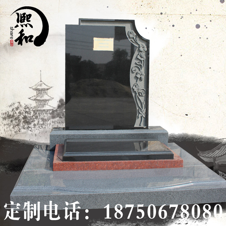 墓碑所使用的材料是最常用 的石材山西黑。盖板造型独特,简单雕刻。碑板为山西黑宽0.6米高0.8米组成,主要 用来雕刻碑文。碑板上石材上雕刻的是藤花。盖板由山西黑印度红石材雕刻而成,样式简单朵。款式 简单素雅,庄重大方。底座也是有芝麻黑石材雕刻而成。该款