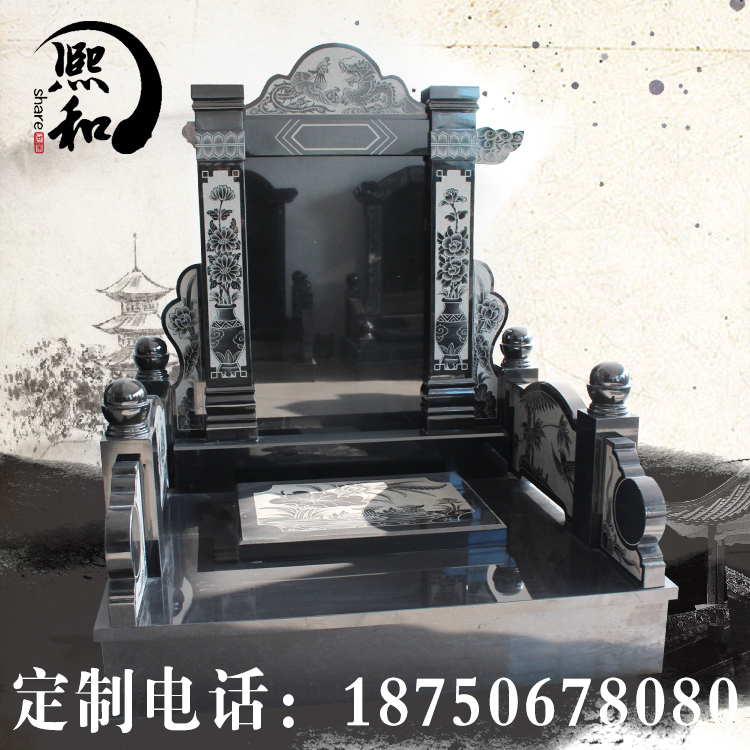 。 主碑板两侧方形柱子上边放置山西黑石雕圆柱光滑表面。主碑板的造型是罕见的造型,碑柱上是喷绘的花瓶与化。整体造型设计非常和谐统一,整体美观度极佳。当 然,这些碑型也是我们结合前人的智慧和客户对于传统文化寄托的需求,不断的深化和优化得到的成果,希望以此给逝者最好的归宿。