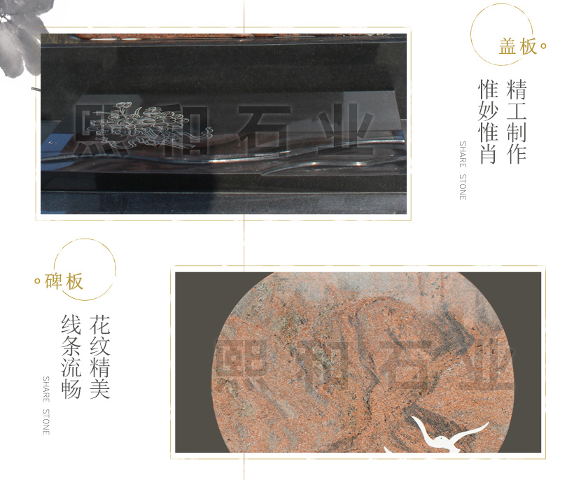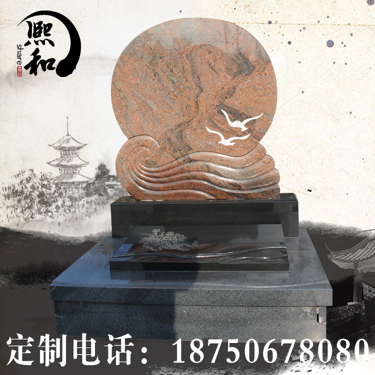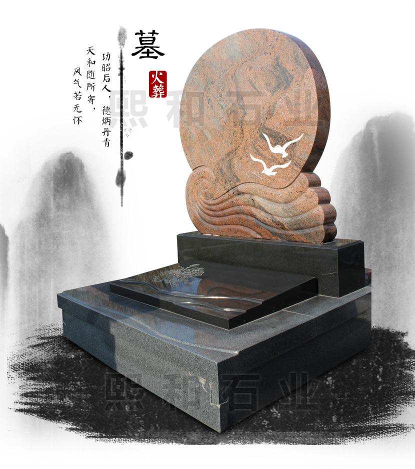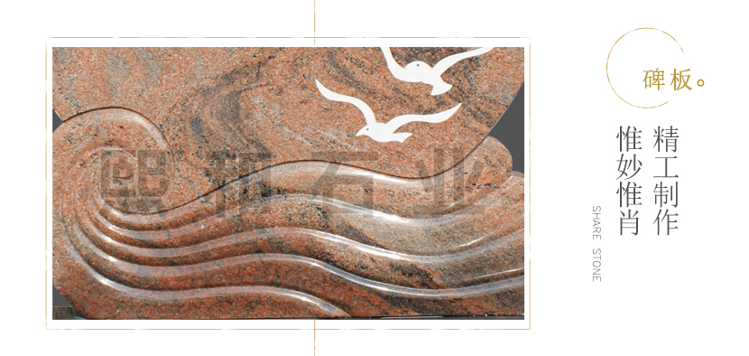 墓碑所使用的材料是最常用的主碑板三峡红,盖板山西黑,底座芝麻黑相结合。碑板为山西黑宽0.6米高0.8米组成,主要用来雕刻碑文。碑板的造型为海浪,好浪上方雕刻了两只白鸥,造型逼真。款式 简单素雅,庄重大方,盖板上雕刻鸟语花香,加上碑柱两侧的碑耳和下沉的台阶。该款