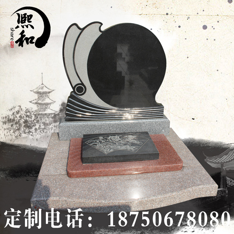 墓碑所使用的材料是最常用 的主碑板山西黑,盖板印度红山西黑石材相结合。盖板造型简单,雕刻花纹图案。碑板为山西黑宽0.6米高0.8米组成,主要 用来雕刻碑文。碑板上又山西黑石材雕刻而成,造型独特形状海浪。底座也是有617石材雕刻而成。该款
