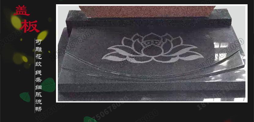 这款墓碑采用印度红石材和芝麻黑石材搭配而成。印度红主碑板不规则的形状,雕刻花朵纹饰,寄托了美好的希冀。底座和盖板都是采用芝麻黑石材,盖板上方还采用线雕技艺雕刻莲花纹饰,寓意吉祥美好,整座墓碑造型沉稳大气,深受国内各大陵园公墓的热订。