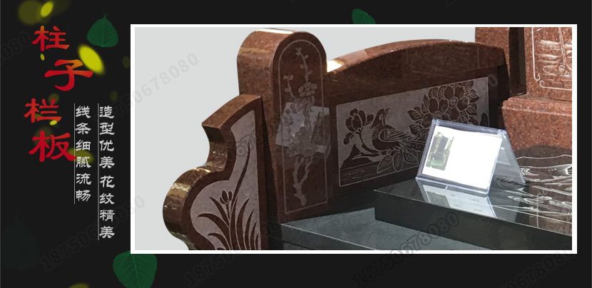 我厂雕刻的这款国内石雕艺术墓碑,采用撞色的效果,印度红的石材搭配山西黑石材,在颜色搭配上衬托的非常成功,给人一种非常舒适的审美视角。主碑板采用山西黑石材裁切出不规则的形状,左边搭配印度红石材雕刻的中式瓦房式的造型作为主碑板的映衬,栏板亦是选用优质的印度红石材雕刻而成,与山西黑盖板的纹饰图案相互呼应,芝麻黑的底座作为颜色的过渡缓和,使得黑白的色差不至于太突兀,整座墓碑给人以赏心悦目之感,不至于太严肃凄寂。