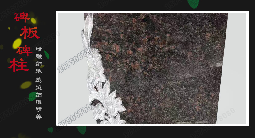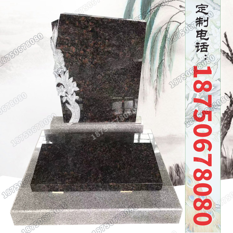 这款墓碑系款式较为新潮的艺术墓碑,选用猫眼石花岗岩雕刻而成,款式独特有创意。采用多重雕刻技艺相结合,主碑板利用浮雕技艺雕刻花草纹饰,寓意美好吉祥。整体给人以端庄大气之感,深受人们的青睐,也是国内各个陵园热订的火葬墓碑款式。