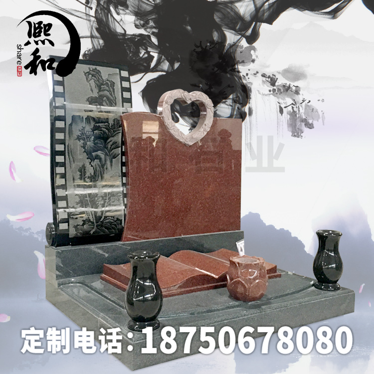 大致高1.2,长1米,宽1米墓碑。主碑板为红黑相间,山西黑石板上雕刻的是松柏与高山。印度红石材碑板上雕刻心形图案。盖板为印度红书本形状。整体造型设计非常和谐统一,整体美观度极佳。当然,这些碑型也是我们结合前人的智慧和客户对于传统文化寄托的需求,不断的深化和优化得到的成果,希望以此给逝者最好的归宿。