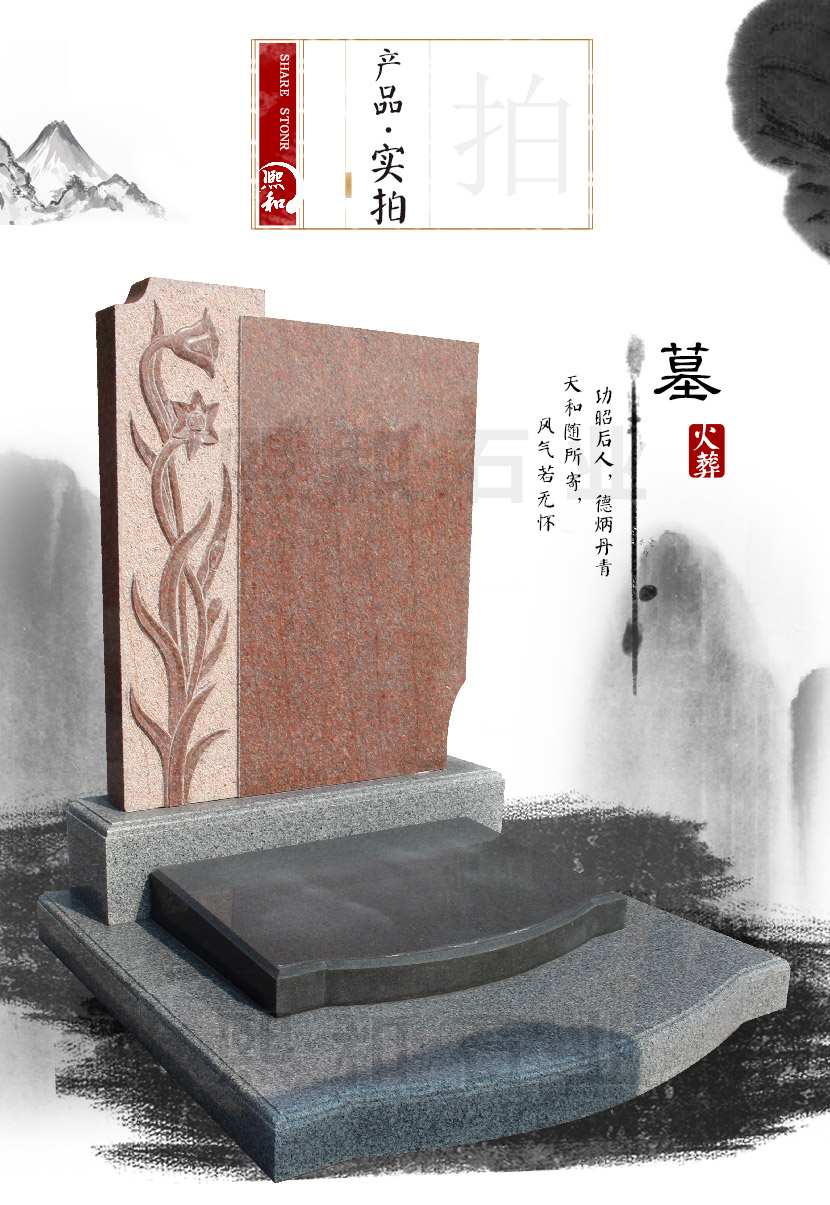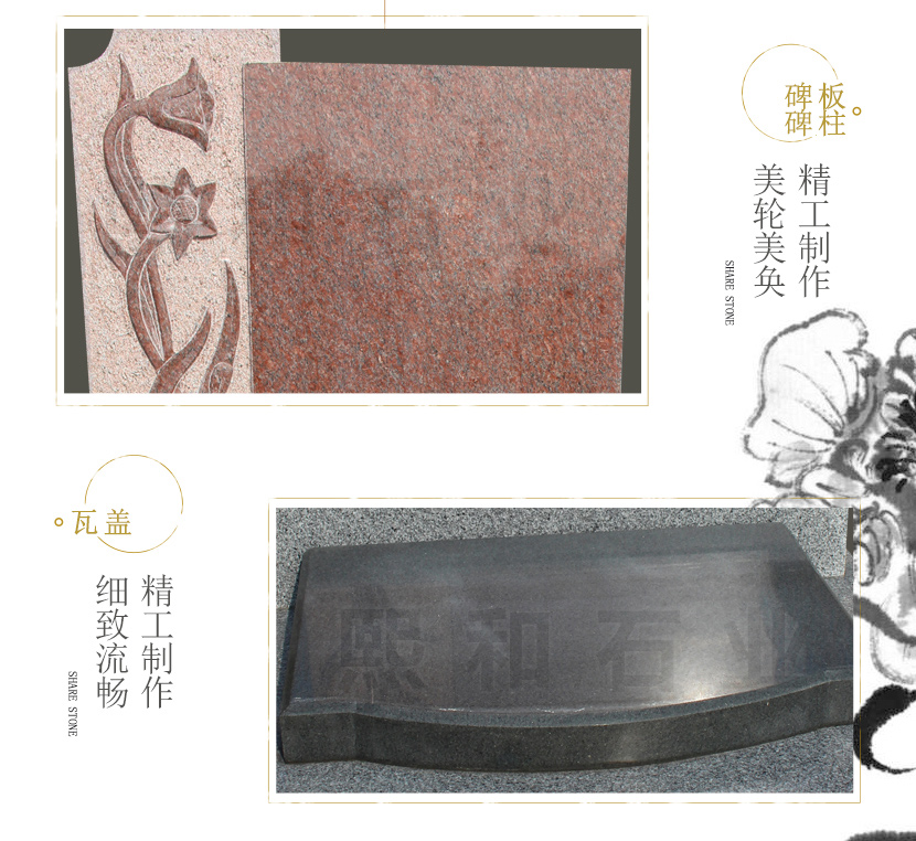 墓碑所使用的材料是最常用的主碑板印度红,盖板山西黑,底座芝麻黑相结合。盖板造型独特,雕刻花纹图案。碑板为山西黑宽0.6米高0.9米组成,主要用来雕刻碑文。款式 简单素雅,庄重大方。底座也是有芝麻黑石材雕刻而成。该款