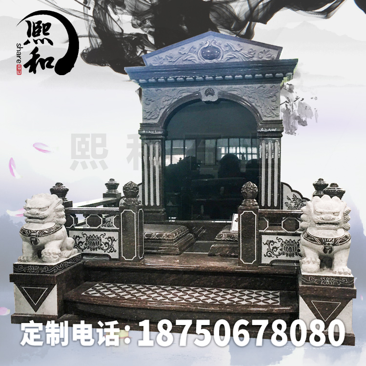 大 致高1.5,长1.4米,宽1.3米墓碑。双人盖板为英国棕石材,整体简单雕刻莲花座图案。整体造型设计非常和谐统一,整 体美观度极佳。栏板前雕刻芝麻白石雕小狮子。当然,这些碑型也是我们结合前人的智慧和客户对于传统文化寄托的需求,不断的深化和优化得到的成果,希望以此给逝者最好的归宿。