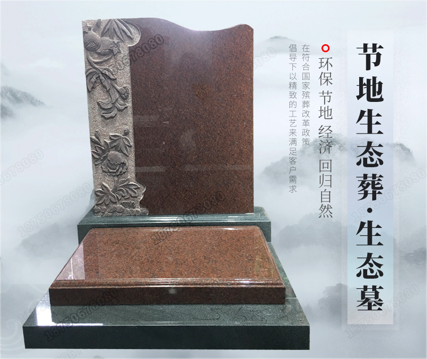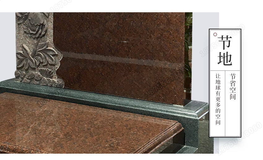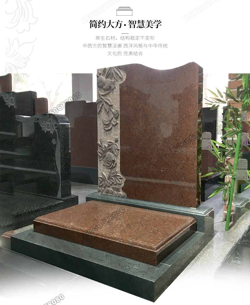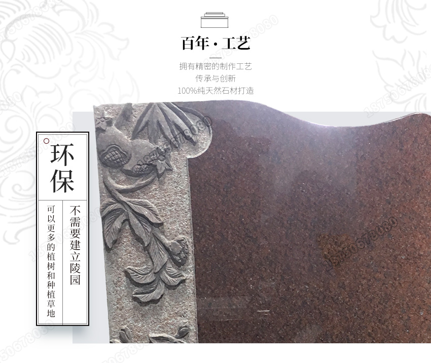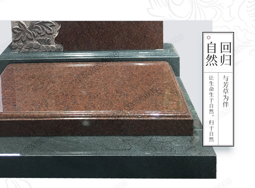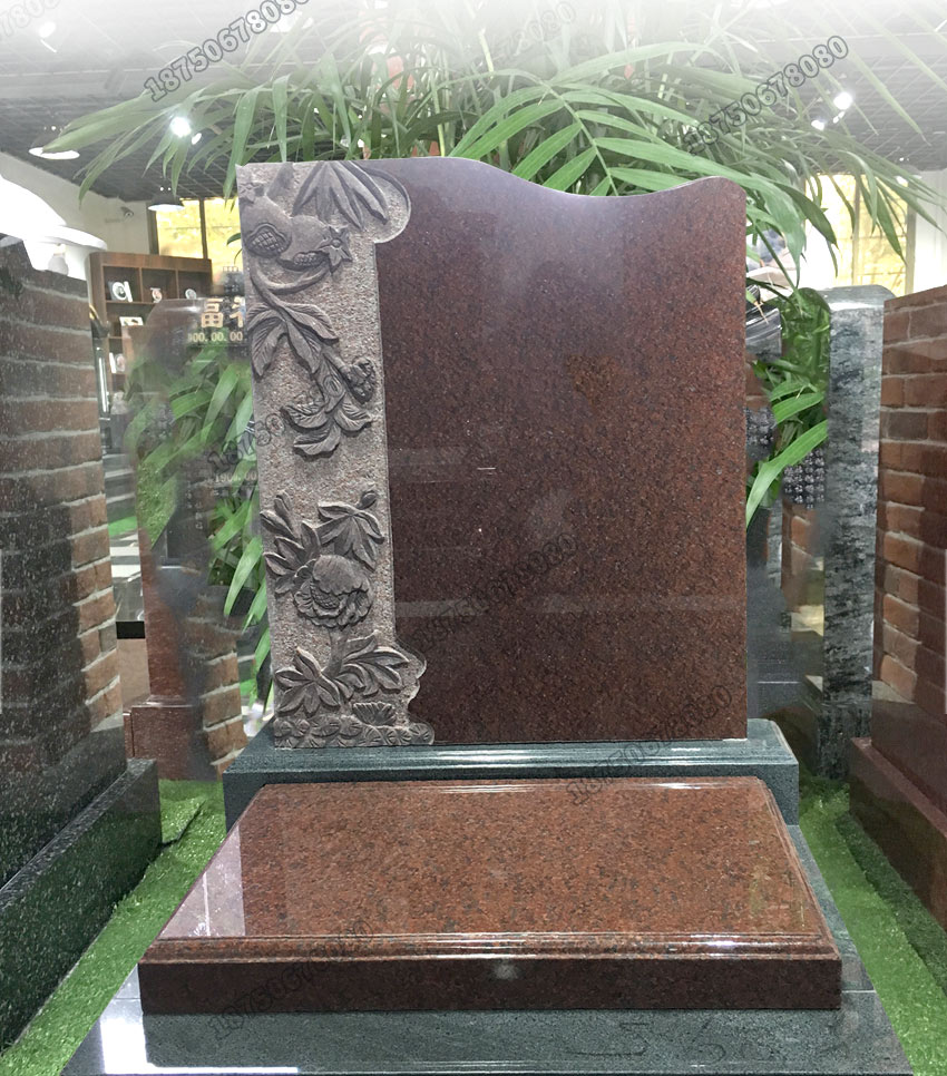 其中,主碑板、盖板都是使用深色系花岗岩,和中国传统墓碑要求的庄重肃穆相契合。主碑板上的图案采用浮雕花草,当然这款
