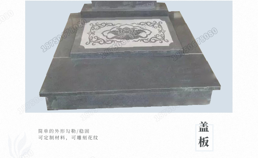 这款墓碑外形比较简单大气,选用优质的山西黑花岗岩石材雕刻而成。没有了碑顶,碑柱、栏板等其他复杂的配件,更多的是展现简单大气的感觉。形状规则的主碑板,没有其他配件的点缀装饰,看似更坚挺、傲立,给人以不可侵犯的神圣感。盖板采用线雕纹饰雕刻莲花纹饰图案及吉祥的图腾,使得简单的