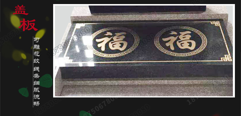 这款墓碑为山西黑石材搭配芝麻白花岗岩石材雕刻而成,中式传统墓碑的气息更加浓厚些。山西黑主碑板采用线雕技艺雕刻花草纹饰,凸显一派生机盎然的氛围,盖板亦是山西黑石材,上采用沉雕技艺雕刻两个“福”字,并喷金沙,寓意美好吉祥。从盖板山的两个字来看,这款墓碑为双穴墓碑,底座系芝麻白花岗岩石材,整座墓碑不管是在造型工艺上亦或是石材颜色搭配上都显得非常的独到,完美。