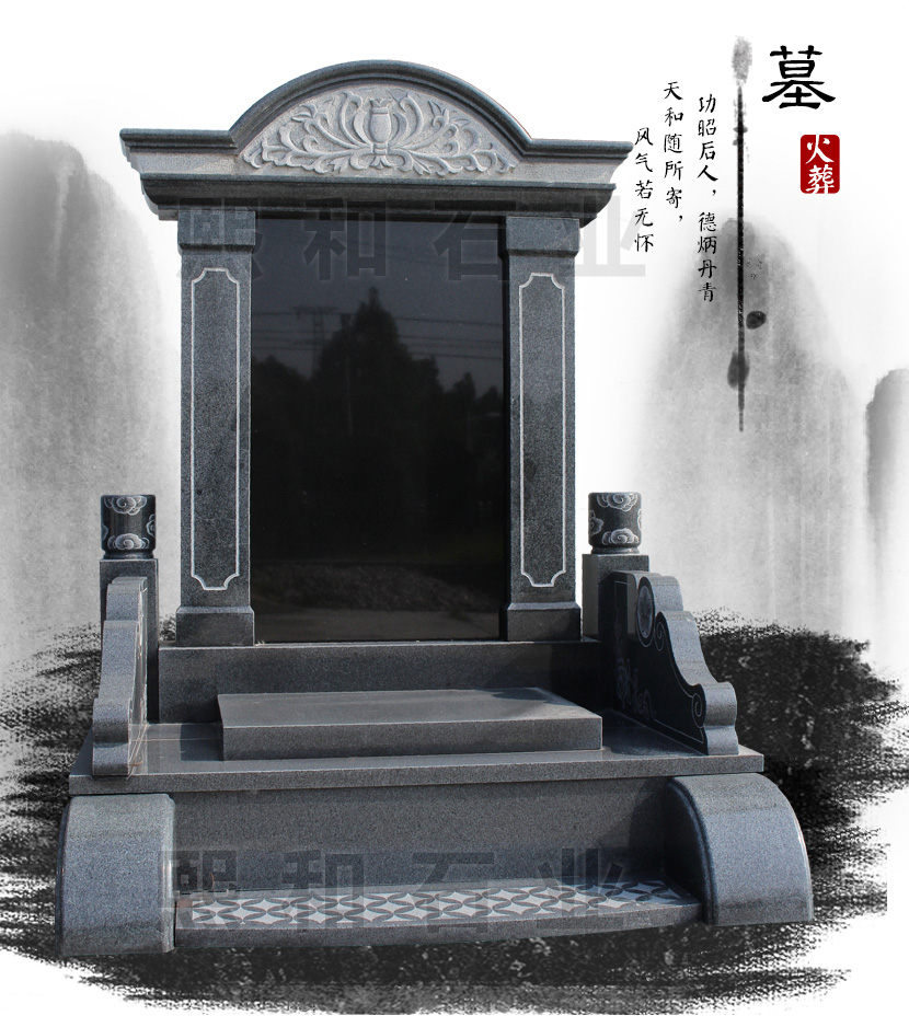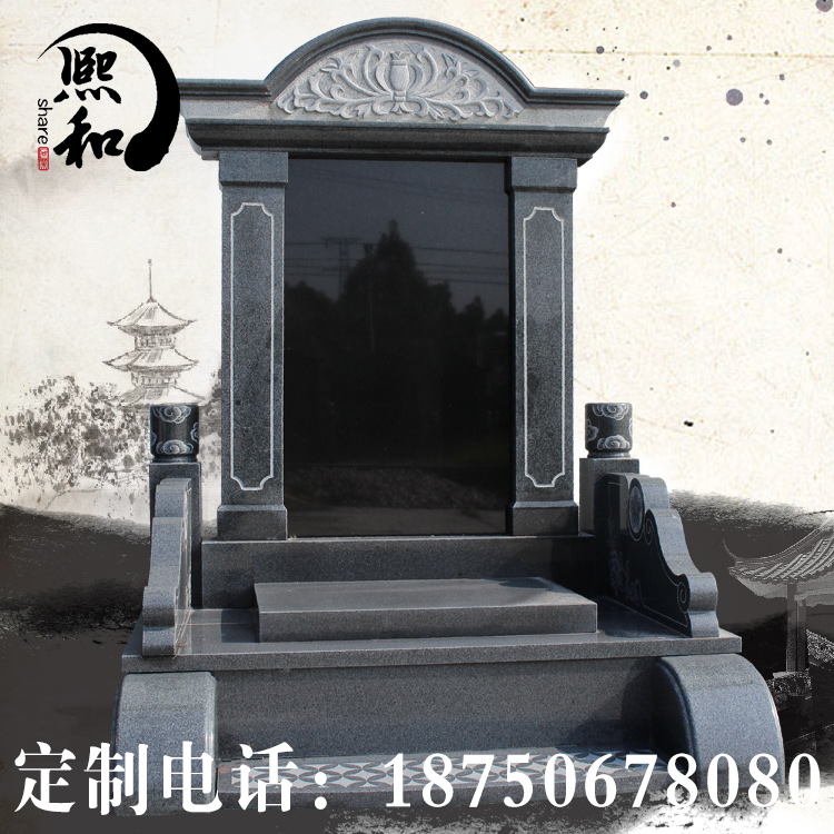 样 品材质采用最常用的山西黑和芝麻黑的材料搭配,整体色调都是偏深色调,给人庄严肃穆的感觉。碑帽是植物的浮雕,碑柱则是线雕形式。栏杆的线条显得非常有现 代感。此款墓碑长1.2米宽1米高1.5米一般来说,盖板和栏杆比较常做的材料也是芝麻黑,但样品使用的是山西黑的,使得整个款型档次有所提升。