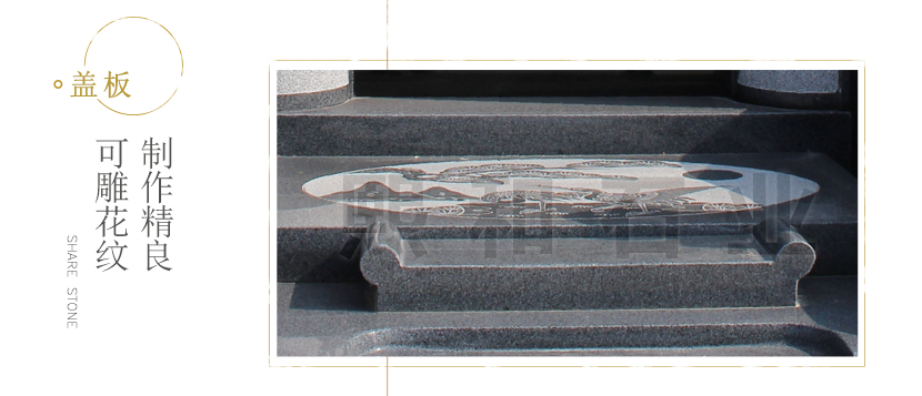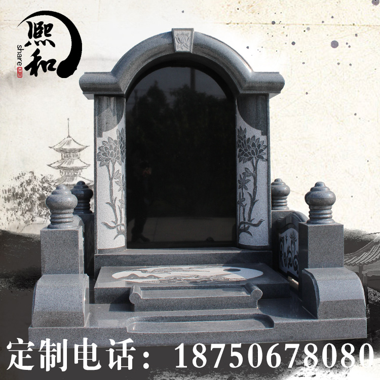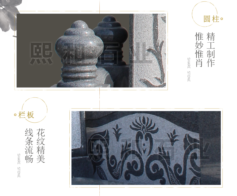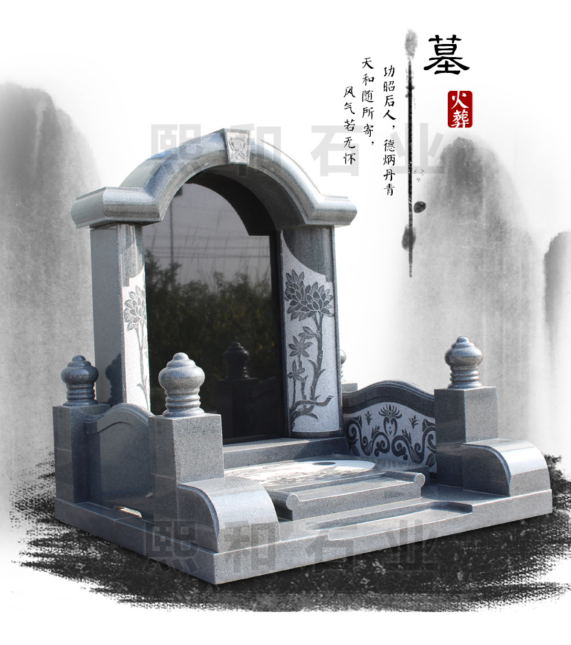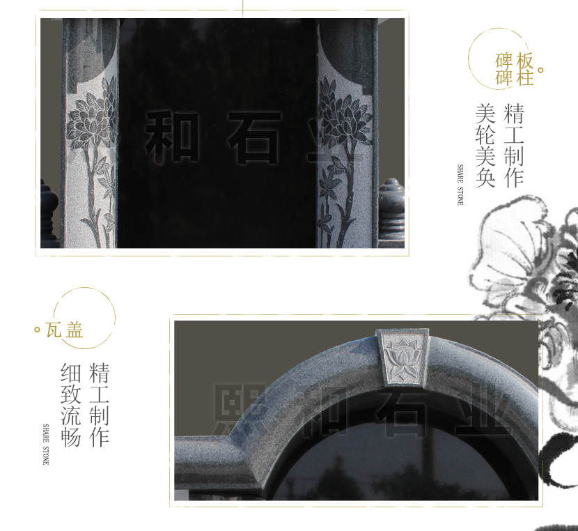 墓碑所使用的材料是最常用的主碑板山西黑,其他零部件为芝麻黑相结合。碑板为山西黑宽0.85米高0.9米组成,主要用来雕刻碑文。墓碑整体构造为碑板到栏板之间是由四根石雕圆柱连接而成,盖板上方有一个莲花图案,雕刻精美。碑柱为芝麻黑石材,上方雕刻花纹图案。栏板为弧形图案,雕刻花纹图案,线条优美。盖板大致宽度为长0.8*0.5.盖板前面这块叫做拜台,是用来盛放贡品的。该款