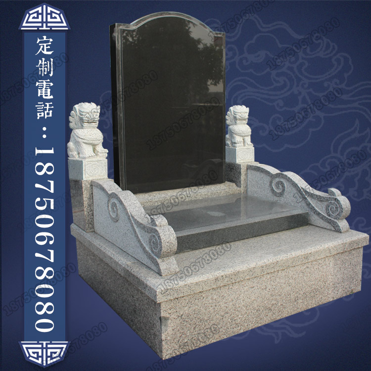 的碑型较为简单,但是线条流畅,简单大气。主碑板两侧放置一对芝麻白石雕小狮子,威严镇宅,有着美好的寓意。主碑板和盖板均采用山西黑深色系石材,凸显整座墓碑的沉稳庄重,栏板造型较为独特,纹饰祥和,该款式的