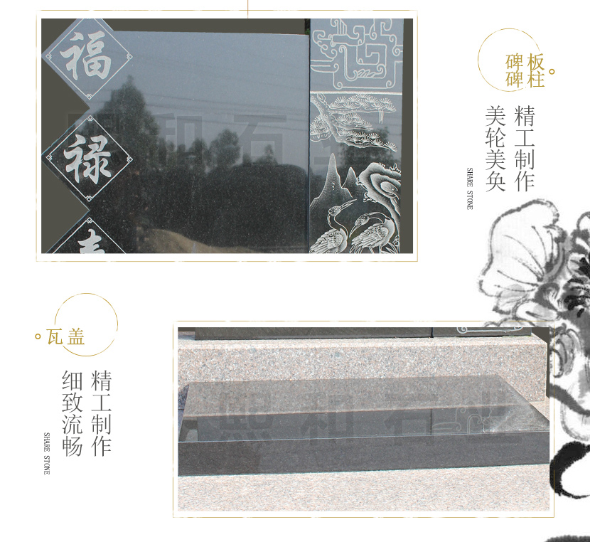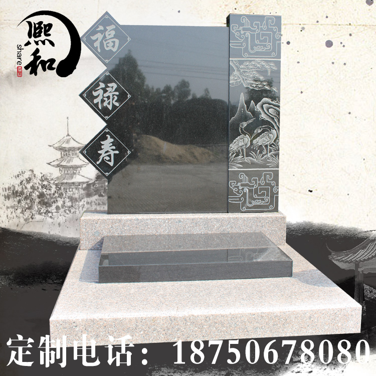 墓碑所使用的材料是最常用 的石材山西黑。盖板造型独特,简单雕刻。碑板为山西黑宽0.6米高0.8米组成,主要 用来雕刻碑文。碑板上石材上雕刻的是福禄寿三字。右边上雕刻仙鹤与松柏。盖板由山西黑石材雕刻而成,样式简单无图案。款式 简单素雅,庄重大方。底座也是有芝麻黑石材雕刻而成。该款