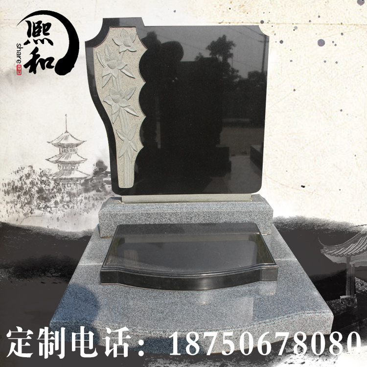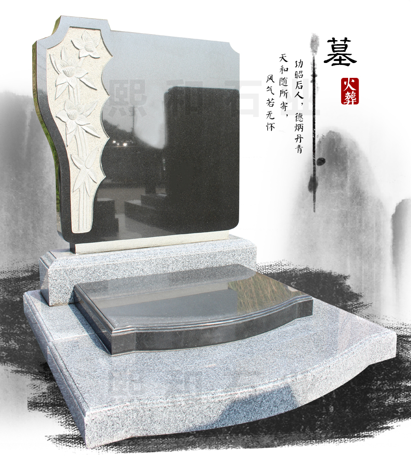 墓碑所使用的材料是最常用 的石材山西黑。盖板造型独特,简单雕刻。碑板为山西黑宽0.6米高0.8米组成,主要 用来雕刻碑文。碑板上石材上雕刻的是两只和平鸽。盖板由山西黑石材雕刻而成,样式简单无图案。款式 简单素雅,庄重大方。底座也是有芝麻黑石材雕刻而成。该款